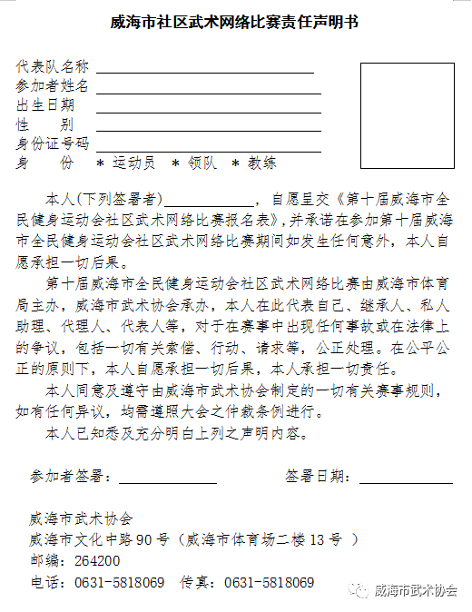2020年威海市社区武术网络比赛责任声明书及比赛报名表下载